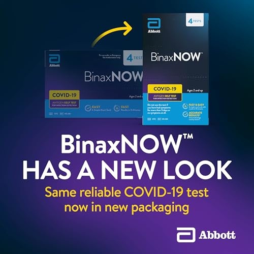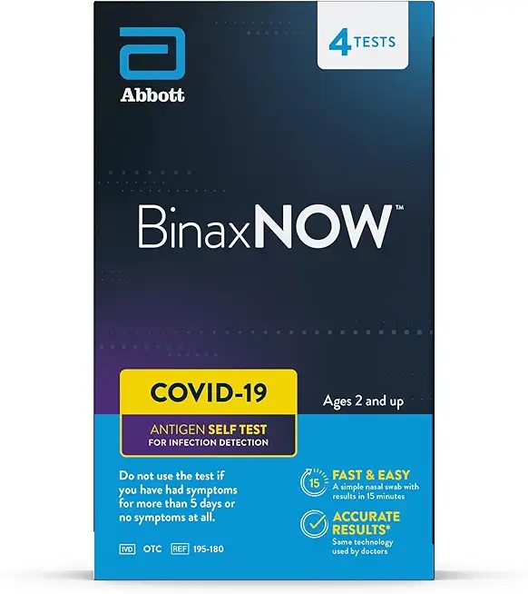 BinaxNOW COVID-19 Antigen Self Test – 4 tests per pack. Provides reliable results in 15 minutes using a simple nasal swab. No lab required – convenient for home, work, or travel testing.