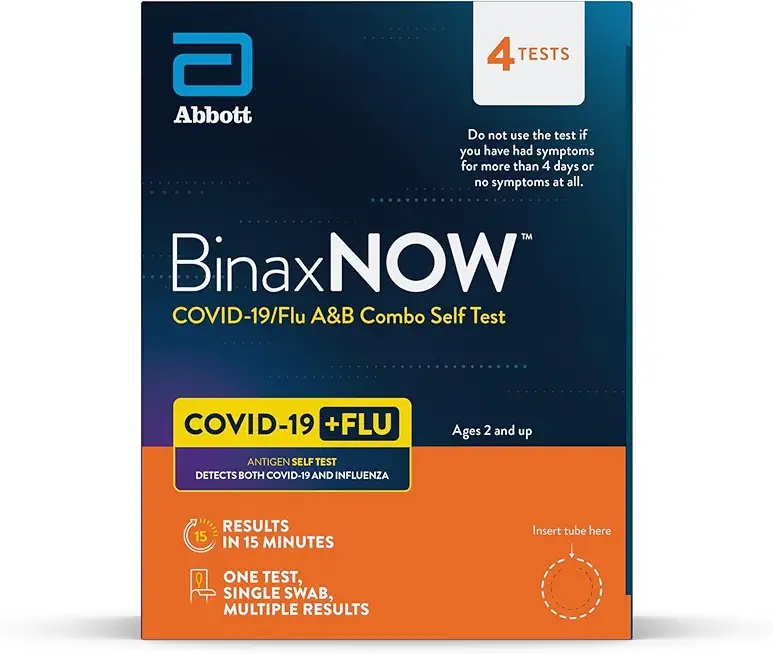 BinaxNOW COVID-19/Flu A&B Combo Self Test – 4 tests. Detects COVID-19, Influenza A, and Influenza B in one easy 15-minute test. Ideal for symptom checking during respiratory season.