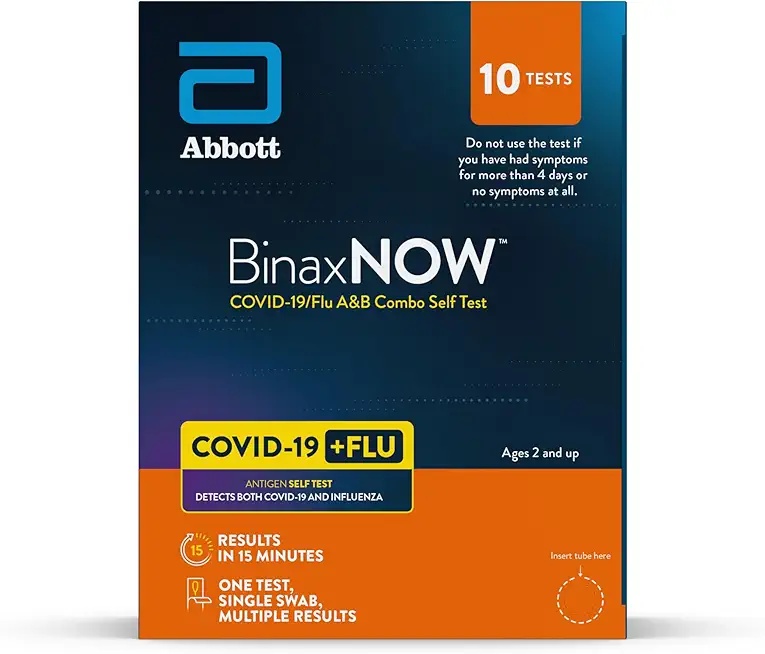 BinaxNOW COVID-19/Flu A&B Combo Self Test – 10 tests. Comprehensive detection of COVID-19, Flu A, and Flu B in one kit. Excellent for households or extended use during peak seasons.